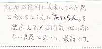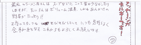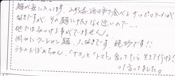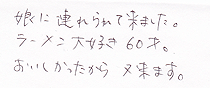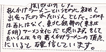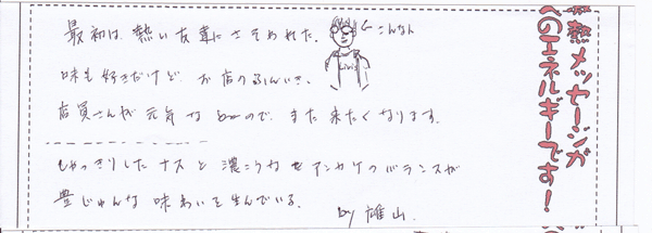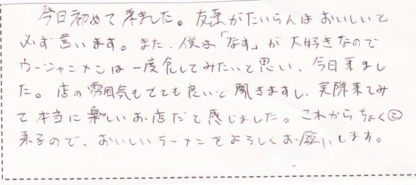 今日初めて来ました。友達がたいらんはおいしいと必ず言います。また、僕は「なす」が大好きなのでウーシャンメンは一度食してみたいと思い、今日来ました。店の雰囲気もとても良いと聞きますし、実際来てみて本当に楽しいお店だと感じました。これからちょくちょく来るので、おいしいラーメンをよろしくお願いします。