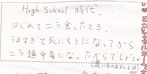 High School時代、はじめてニラ食ったとき、うますぎて死にそうになってからニラ麺中毒になったからでしょう。(濃い目のあましょっぱいのが)