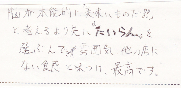脳が本能的に「美味いものだ!!」と考えるより先に『たいらん』を選ぶんで雰囲気、他の店にない食感と味つけ、最高です。