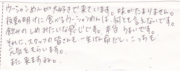 ウーシャンめんが大好きで来ています。味がたまりません。夜勤明けに食べるウーシャンめんは、何とも言えないです。飲みのしめみたいな感じです。本当うまいです。