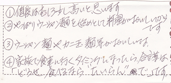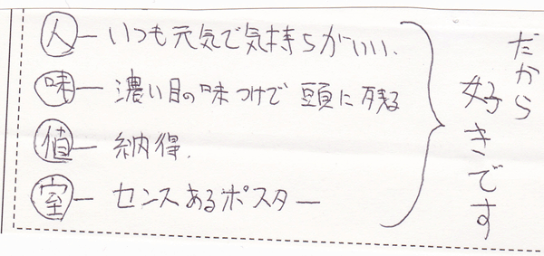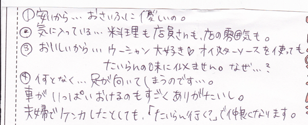 - 気に入っている…料理も店員さんも、店の雰囲気も。
