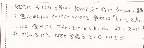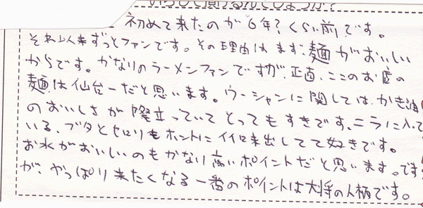 初めて来たのが6年?くらい前です。それ以来ずっとファンです。その理由はまず麺がおいしいからです。かなりのラーメンファンですが、正直、ここのお店の麺は仙台一だと思います。ウーシャンに関しては、かき油のおいしさが際立っていてとってもすきです。ニラに入っているブタとセロリもホントにイイ味出してて好きです。