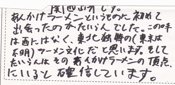 あんかけラーメンというものに初めて出会ったのがたいらんでした。この味は西にはなく、東北独特の(東京は不明)ラーメン文化だと思います。そしてたいらんはそのあんかけラーメンの頂点にいると確信しています。
