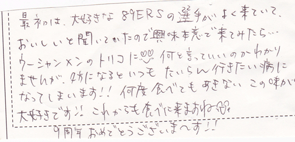 最初は大好きな89ERSの選手がよく来ていて、おいしいと聞いていたので興味本意で来てみたら…ウーシャンメンのトリコに(^v^)何を言っていいのかわかりませんが、夕方になるといつもたいらん行きたい病になってしまいます!!何度食べてもあきないこの味が大好きです!!これからも食べに来ますね(^U^)