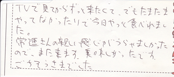 常連さんの親しい感じがうらやましかったので、また来ます。美味しかったです。ごちそうさまでした。