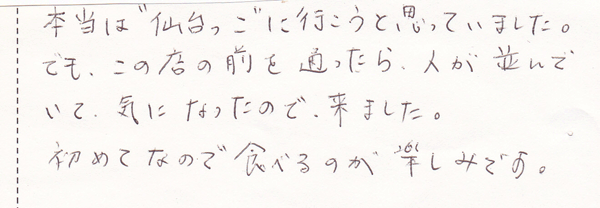 本当は“仙台っこ”に行こうと思っていました。でも、この店の前を通ったら、人が並んでいて、気になったので、来ました。