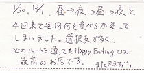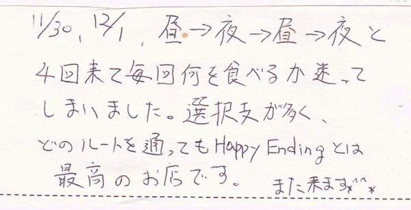 11/30、12/1、昼→夜→昼→夜と4回来て毎回何を食べるか迷ってしまいました。選択肢が多く、どのルートを通ってもHappy Endingとは最高のお店です。また来ます*^ ^*