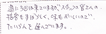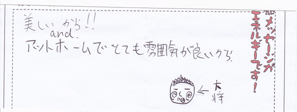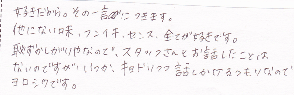 恥ずかしがりやなので、スタッフさんとお話したことはないのですが、いつか、キョドリつつ話しかけるつもりなのでヨロシクです。
