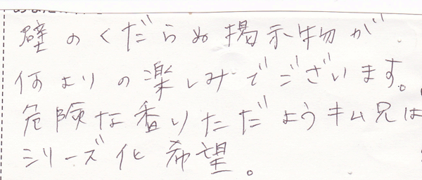 壁のくだらぬ掲示板が何よりの楽しみでございます。危険な香りただようキム兄はシリーズ化希望。