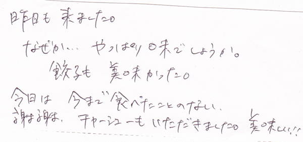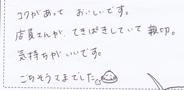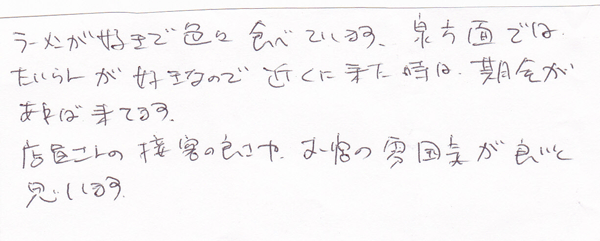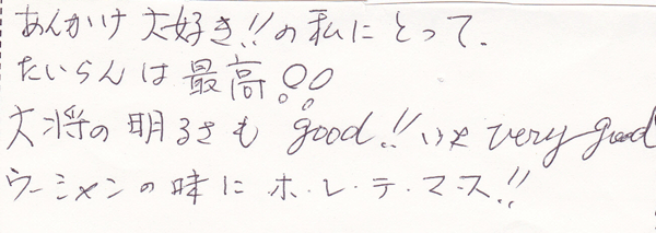 うまいだけの店なら他にもあると思うんですけど、たいらんのは本当に純すいにおいしいからたべにいきたいといつも思ってるんできています。毎日たべてもあきないと思ったのはここの味だけですので、これからも食べにきたいと思います。