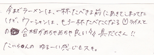 今までラーメンは、一杯たべきる前にあきてしまってたけど、ウーシャンはもう一杯たべたくなる ライスとの相性がめちゃめちゃ良い☆具だくさん!!