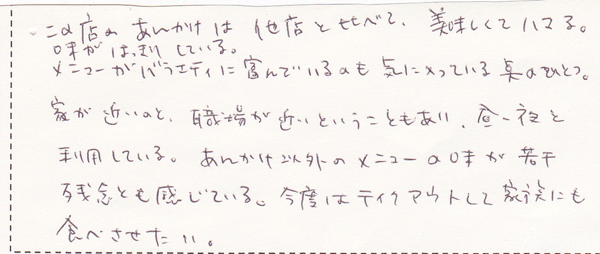 メニューがバラエティに富んでいるのも気に入っている点のひとつ。家が近いのと、職場が近いということもあり、昼・夜と利用している。あんかけ以外のメニューの味が若干残念とも感じている。今度はテイクアウトして家族にも食べさせたい。 |