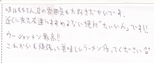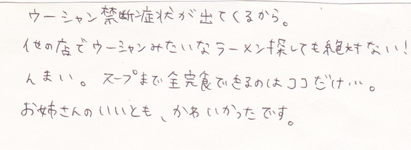 他の店でウーシャンみたいなラーメン探しても絶対ない!うまい。スープまで全完食できるのはココだけ…。
