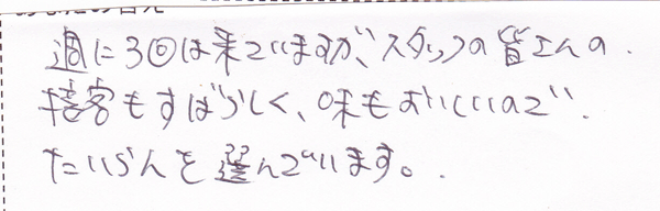 週に3回は来ていますが、スタッフの皆さんの接客もすばらしく、味もおいしいので、たいらんを選んでいます。