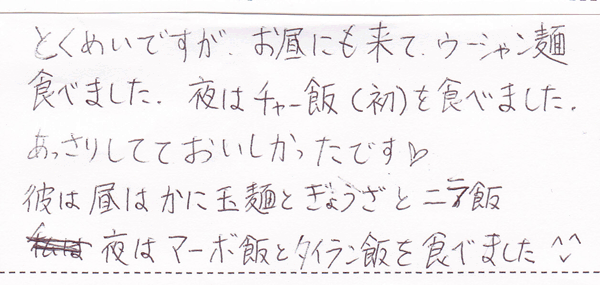 とくめいですが、お昼にも来てウーシャン麺食べました。夜はチャー飯(初)を食べました。あっさりしてておいしかったです(ハート)