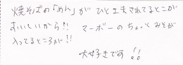 焼きそばの「めん」がひと工夫されてるとこがおいしいから!! マーボーのちょっとみそが入ってるところが!!