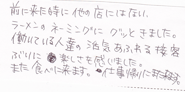 前に来た時に他の店にはない、ラーメンのネーミングにグッときました。働いている人達の活気あふれる接客ぶりに楽しさを感じました。