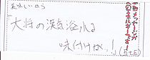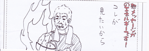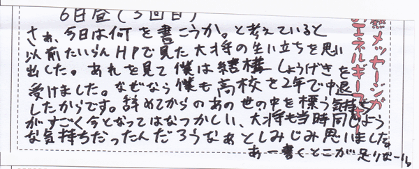 さぁ、今日は何を書こうか。と考えていると以前たいらんHPで見た大将の生い立ちを思い出した。あれを見て僕は結構しょうげきを受けました。なぜなら僕も高校を2年で中退したからです。辞めてからのあの世の中を漂う気持ちがすごく今となってはなつかしい、大将も当時同じような気持ちだったんだろうなあとしみじみ思いました。あー書くとこが足りなーい。 |