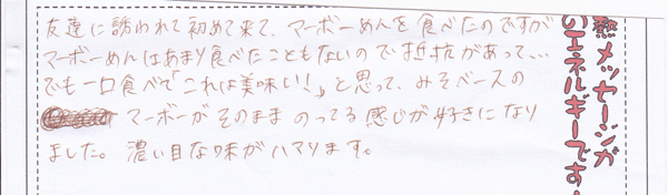 友達に誘われて初めて来て、マーボーめんを食べたのですが、マーボーめんはあまり食べたこともないので抵抗があって…でも一口食べて「これは美味い!」と思って、みそベースのマーボーがそのままのってる感じが好きになりました。濃い目な味がハマリます。 |