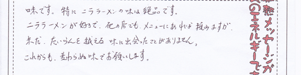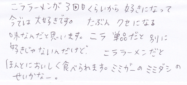 ニララーメンが3回目くらいから好きになって、今では大好きです。たぶんクセになる味なんだと思います。ニラ単品だと別に好きじゃないんだけど、ニララーメンだとほんとにおいしく食べられます。ミミガーのミミダシのせいかなー。 |