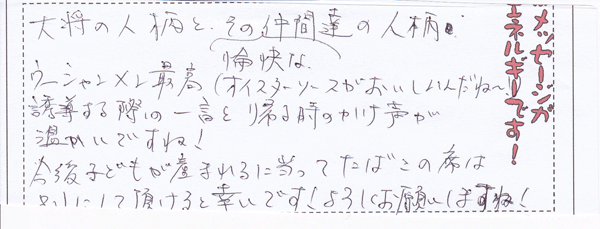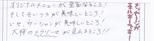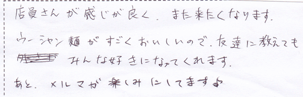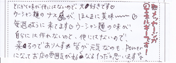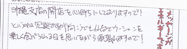 沖縄支店の開店を心待ちにしておりますので!というのは冗談ですが、向こうでも仙台でウーシャンを楽しく食べられる日を思いながら頑張れますので! |