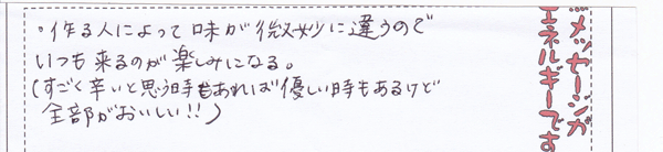 (すごく辛いと思う時もあれば優しい時もあるけど、全部がおいしい!!) |