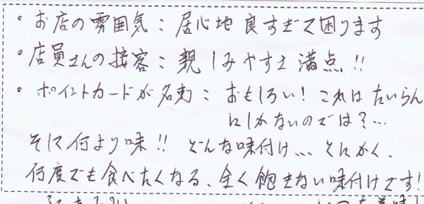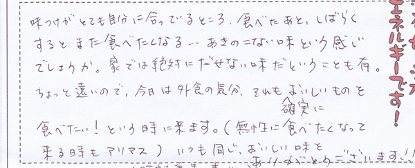 味つけがとても自分に合っているところ。食べたあと、しばらくするとまた食べたくなる…あきのこない味という感じでしょうか。家では絶対にだせない味だということも有。ちょっと遠いので、今日は外食の気分、それも確実においしいものを食べたい!という時に来ます(無性に食べたくなってくる時もアリマス)いつも同じおいしい味をありがとうございます!! |