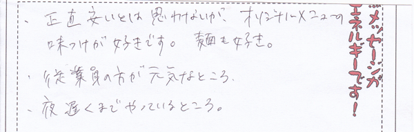 ・正直安いとは思わないが、オリジナルメニューの味つけが好きです。麺も好き。