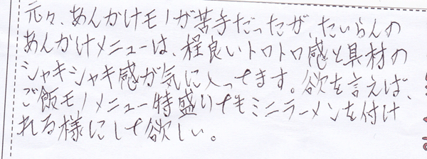 元々、あんかけモノが苦手だったが、たいらんのあんかけメニューは、程良いトロトロ感と具材のシャキシャキ感が気に入ってます。欲を言えば、ご飯モノメニュー特盛りでもミニラーメンを付けれる様にして欲しい。 |
