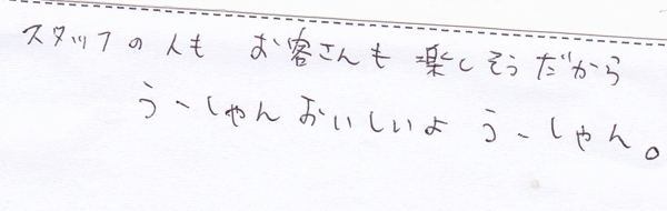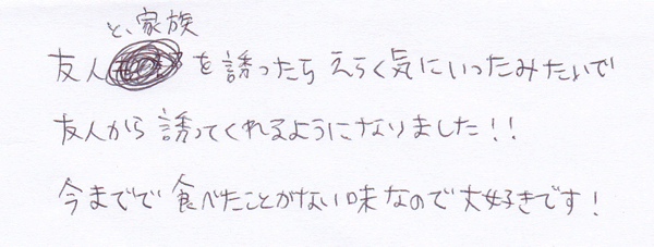 友人と家族を誘ったらえらく気にいったみたいで、友人から誘ってくれるようになりました!!今までで食べたことがない味なので大好きです! |