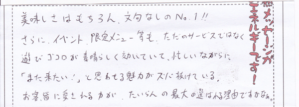 さらに、イベント限定メニュー等も、ただのサービスではなく、遊びゴコロが素晴らしく効いていて、忙しいながらに「また来たい!」と思われる魅力がズバ抜けている。